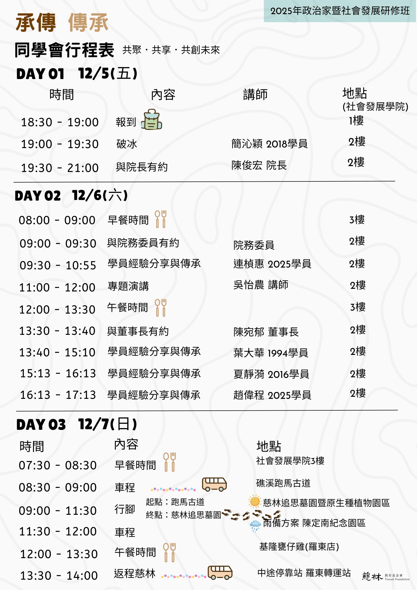 各位學員,大家平安: 為延續「2016-2019年、2025年慈林政治家暨社會發展研修班同學會」之間的交流與學習, 我們將於12月5日(五)至12月7日(日)辦理三天二夜同學會, 活動地點慈林社會發展學院(宜蘭縣五結鄉二結路418號), 期待您的參與,讓這場聚會不只是重逢,更成為傳承與啟發的舞台! 報名截止日:11月27日(四)17:00前 報名網址:👉請點我報名 同學會行程表如下